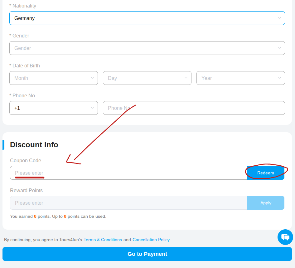 - Weiter zu den persönlichen Daten: Im Schritt zur Eingabe deiner persönlichen Daten findest du das Feld „Coupon Code“.